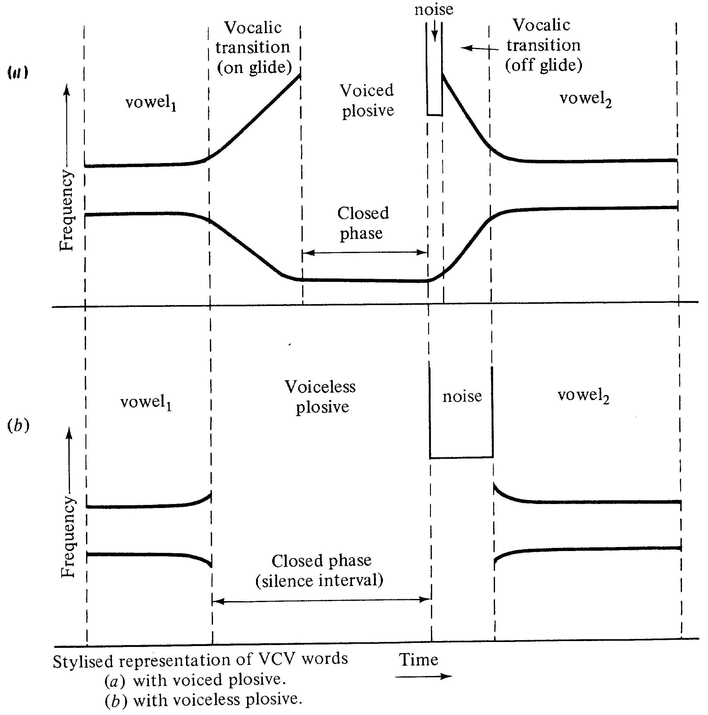 Figure 4: Phases of a plosive consonant, after I.H. Slis and A. Cohen, “On the complex regulating the voiced-voiceless distinction II”,
